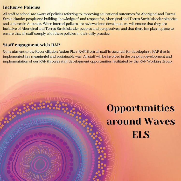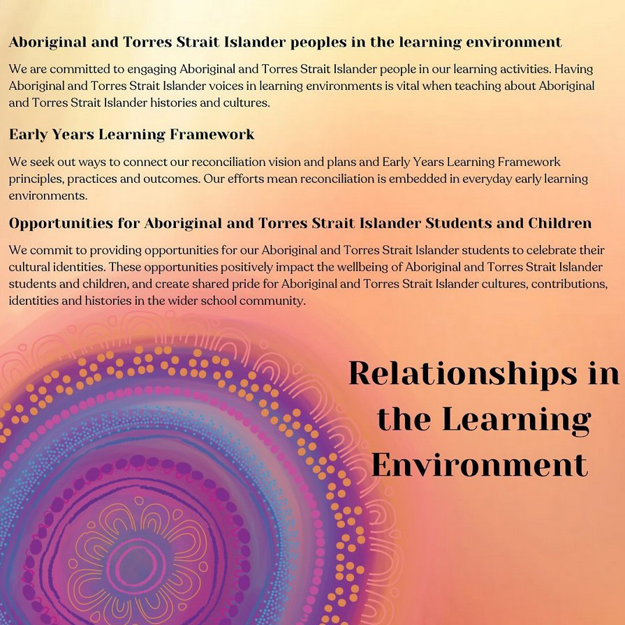 Waves educators, children, and families will engage in reconciliation on a personal and professional level, creating settings that support Aboriginal and Torres Strait Islander social justice, equality, and equity. We are setting the groundwork for future generations to cherish and recognise Aboriginal and Torres Strait Islander cultures and history as an important component of our common identity through this vision.